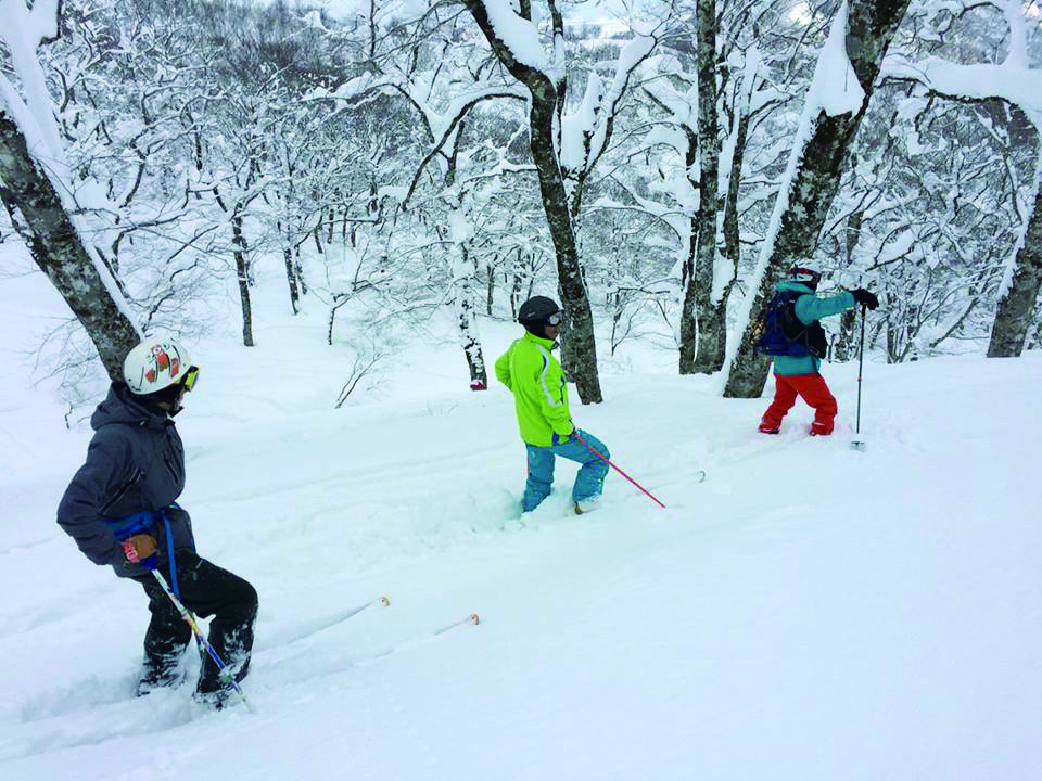 経験者なら「豪雪ツリーランガイド」へ。夏油ローカルのガイドが多彩なエリアの中から、その日の雪質や前夜からの天候も考慮してベストなスポットへ2時間みっちりと案内してくれる。前夜に降雪がなくても驚きのパウダー吹き溜まりを見つけられるかも!
