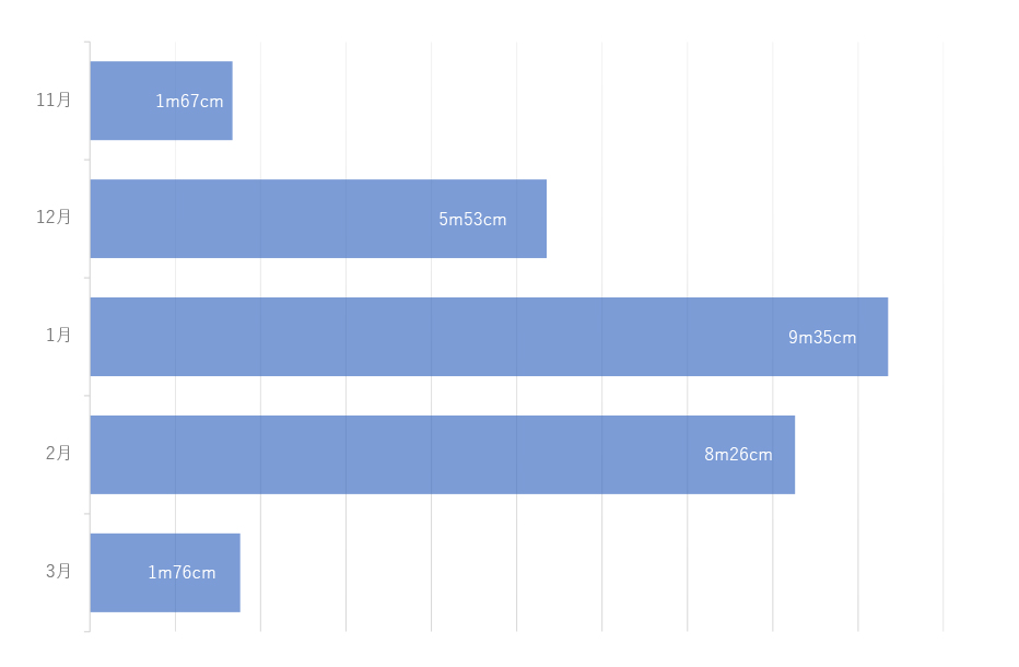 夏油の山頂エリアでの年間平均積雪量は、過去9年間データでなんと累計22m超えている。これは地上7階建てのビルに相当する量で、もう驚くしかないだろう。シーズン中の積雪量をグラフで見るとこうだ。