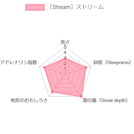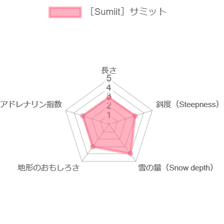 次に、一つずつスペックや攻め方を詳しく見ていこう。木の密度、難易度や危険度は夏油高原の公式HPにて公表されているもの。レーダーチャート化した、長さ・斜度・雪の量・地形のおもしろさ・アドレナリン指数は、「日本一夏油高原を滑っている社長」の菅原三多英さんにスコアリングいただいたものだ。さらに、達人・菅原さんに、そのエリアのとっておき「攻略法」のコメントも頂いた。