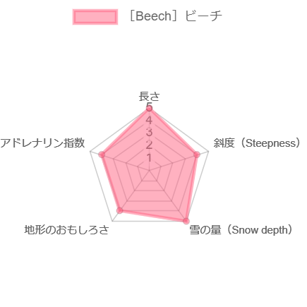 スタートはスティープな尾根がいくつか並び、中盤は徐々に斜度が緩くなってピーチと合流。谷状の地形によってナチュラルパイプになっているので流れるようなライディングが楽しめる。ビーチとの境目付近は広大なボール状のエリアもあり、ビッグターンも決められる。ブナの老木も多く、幻想的な雰囲気も魅力。