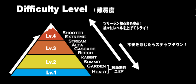 上の図を見ると、これならツリーランに初挑戦の人でもどこから挑戦すればいいか判断しやすく、レベルに合わせてエリアをチョイスすることができる。事故やケガなどのリスクを回避することができて安心だ。今の自分のレベルを攻略したら、次はどこを目指せばいいのかが一目瞭然。