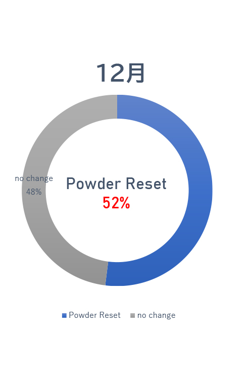 夏油のハイシーズンにおける「POWDERリセット率」(夏油高原スキー場発表,2022)を見てみると、驚くばかり。ここに行けば、かなりの確率でパウダーに当たりそうな気がする。