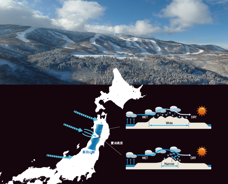 夏油高原の位置する場所には、東北の背骨といわれる奥羽山脈があり南北を500㎞に渡って縦断する。日本海から流れ込む雪雲は奥羽山脈に雪を降らせながら乾燥し、太平洋側へ抜けていく。山脈の幅が広ければ広範囲に雪をもたらすが、夏油高原の辺りはちょうど山脈のくびれの部分にあたるため、雪雲が集まりやすく、狭い範囲に集中して雪を落とすのだ。上のイラストで見ると夏油高原の狭い範囲に降雪が集中するイメージが視覚で理解しやすい!