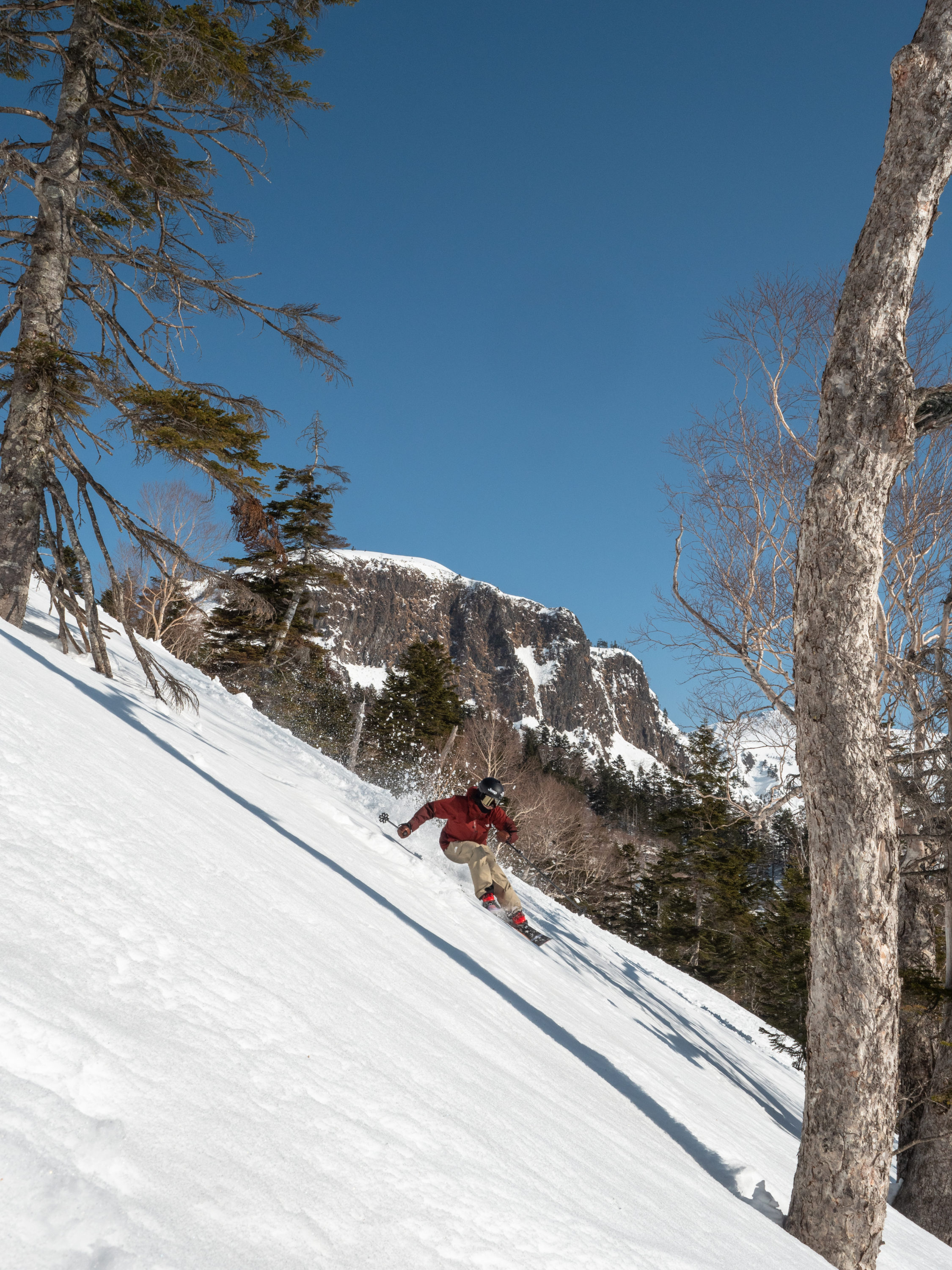 川場はコースのバラエティが富んでいるのがいいですね。景観も良くて、スキー場トップのさらに奥にある剣ヶ峰山をバックに撮ったツリーランエリアでの写真はまるでイタリアのドロミテを思わせるような1枚に!日本じゃないようなロケーションは海外を旅してきた私には心躍る光景でした。