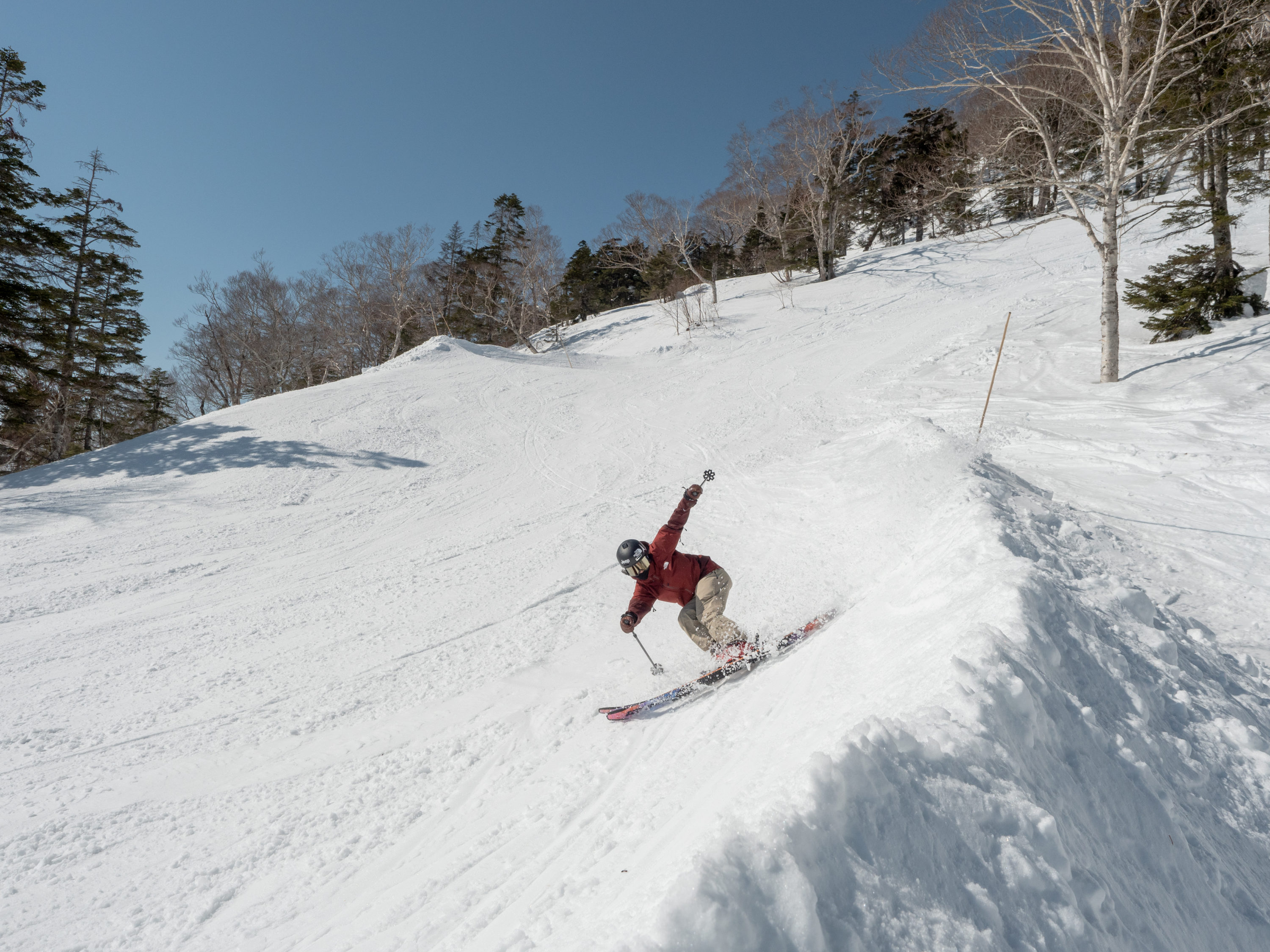 川場の魅力はファーストトラックやツリーランに留まらない。ゲレンデ内の至る所に壁やバンクがあり、普通に滑るだけでも面白いのだ。