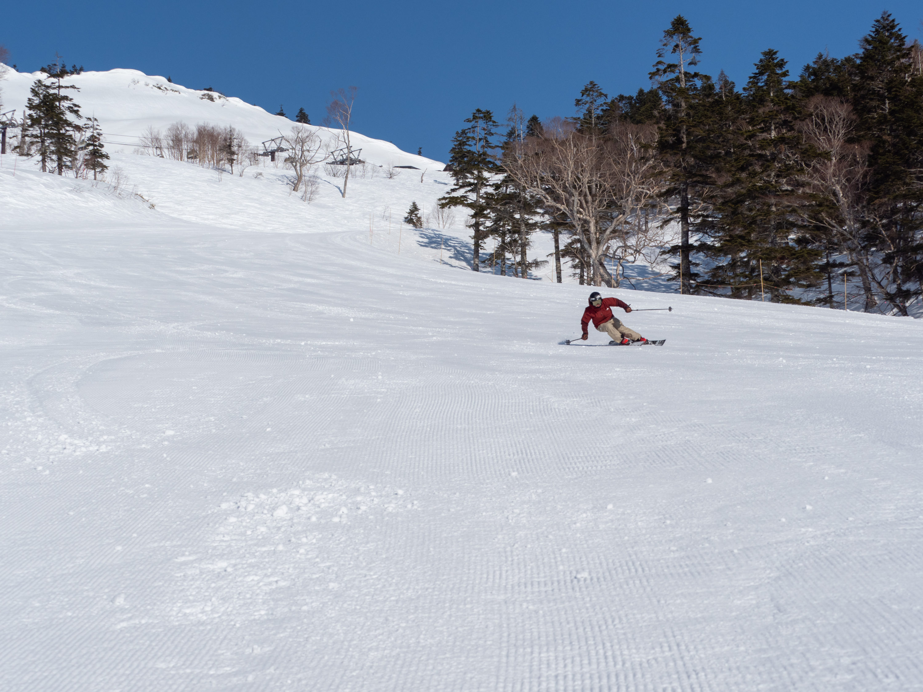 「川場は今回で3回目です。一度、サラッサラのパウダーの日を滑り、川場のポテンシャルの高さに驚きました。今回は初めてのファーストトラックへ。滑走距離も充分で、これはかなり贅沢なサービスだなというのが第一印象。綺麗に圧雪されたグルーミングバーンが最高に気持ちいいですね。