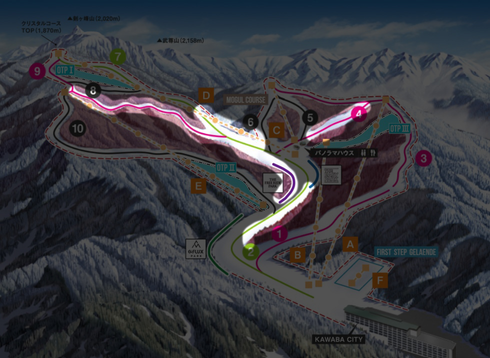 OFF THE PISTE(OTP)は3カ所あり、下マップの水色部分のような配置になっている。
