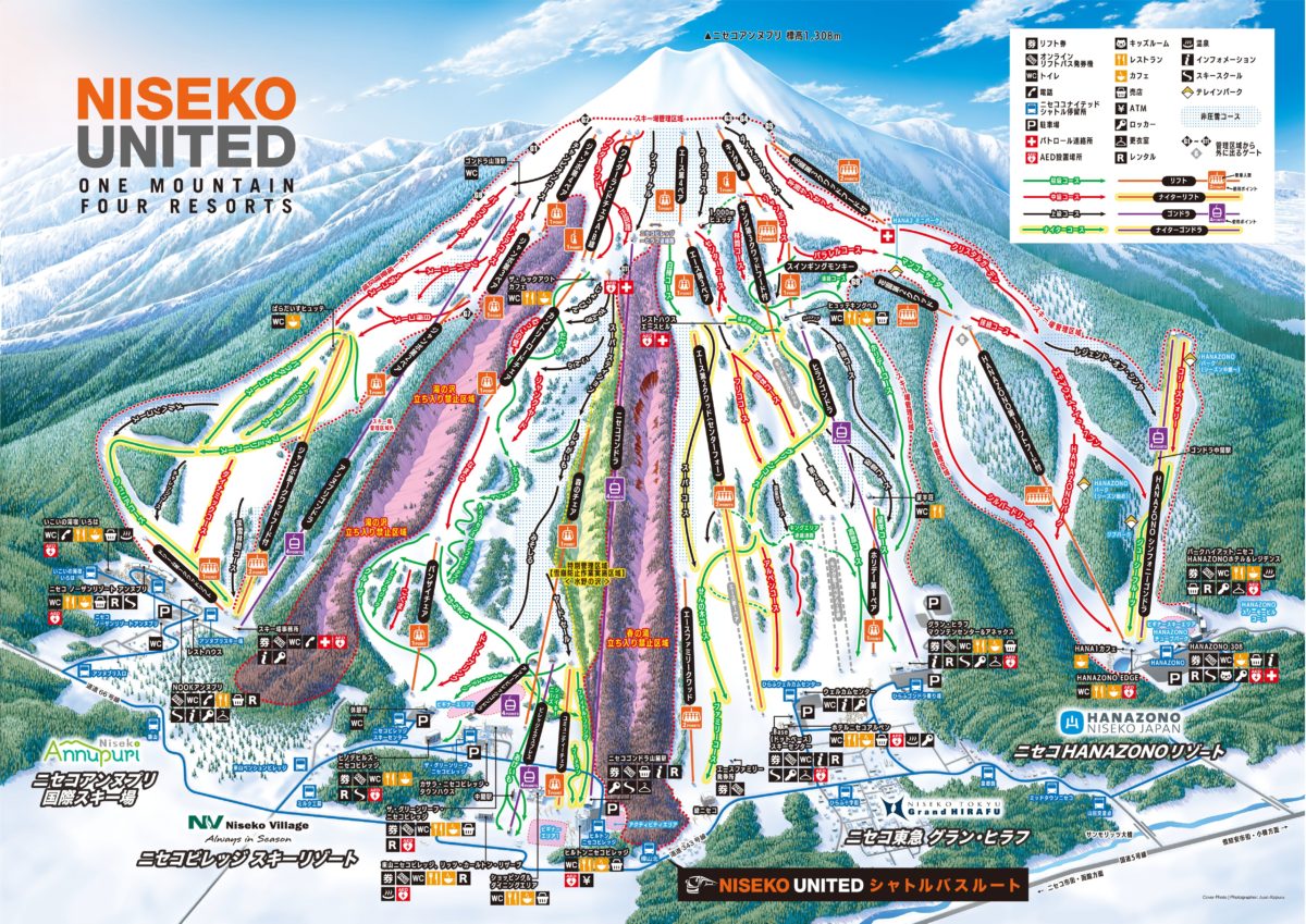 札幌から南へ約100km、ニセコアンヌプリ山(1,308m)の裾野に広がる、4つの広大なスキー場、ニセコHANAZONOリゾート、ニセコ東急 グラン・ヒラフ、ニセコビレッジスキーリゾート、ニセコアンヌプリ国際スキー場から成る「ニセコユナイテッド」。全山共通のリストパスで自由に行き来ができ、「JAPOW(ジャパウ)」と名付けられた世界的に有名な極上のパウダーや、ゲレンデからもアクセスできる広大なバックカントリー、蝦夷富士と呼ばれる美しい羊蹄山、日本情緒あふれる温泉などの魅力で、世界中からゲストを集めるインターナショナルリゾートだ。