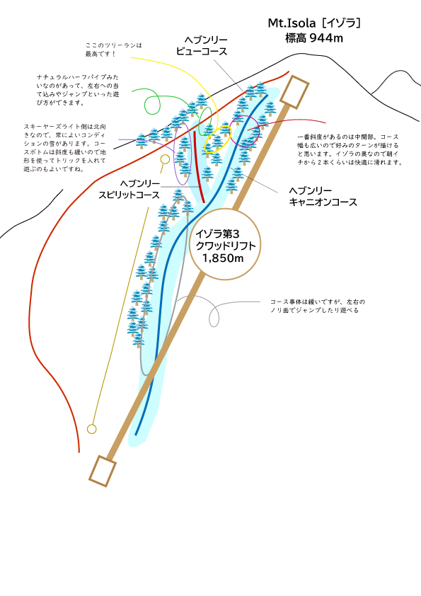 Mt.イゾラの山頂に向かって架かっている「イゾラ第3クワッドリフト」ですかね。自分は非圧雪が好きなのでこのリフトで「ヘブンリーキャニオンコース」と「ヘブンリースピリットコース」を回すことが多いです。楽しいポイントをイラスト上に示しますね。