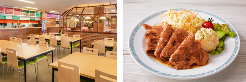 地元素材のグルメを手軽に味わえるハイランドロッジ2Fのレストラン。写真のルスツ高原ポークを使った生姜焼き定食が一番人気。
