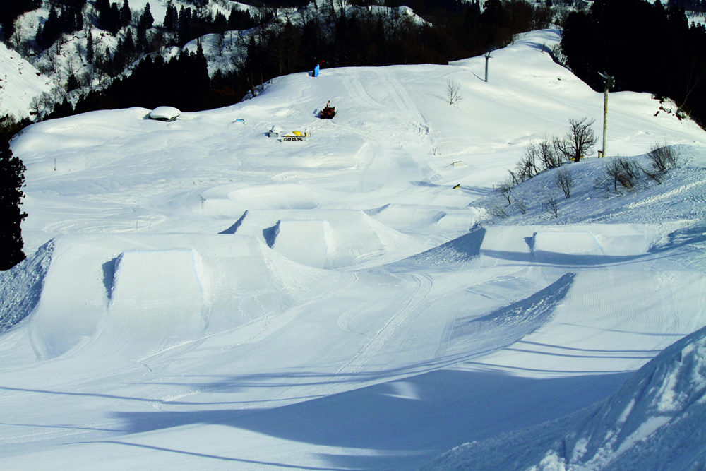 石打丸山のもう一つの売りが、圧倒的に充実したパーク。広いスペースにジャンプ系のアイテムが、流れを持ってメイクできるようレイアウトされている。国内最大級のスーパーパイプは、一度はチャレンジしてみるべきシロモノだ。