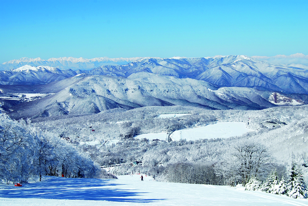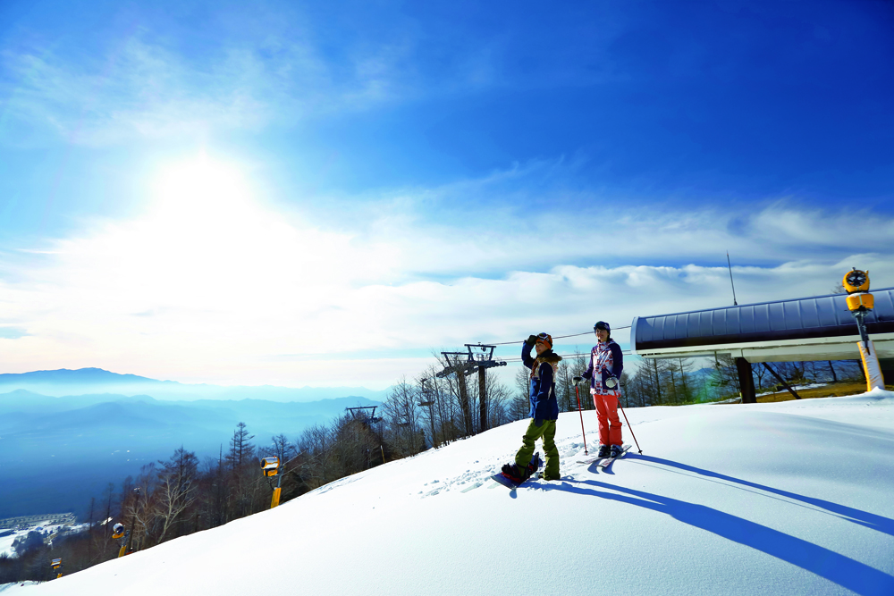 ゲレンデは木立が少なく視界も良好。コースも幅広く、林の区切りがない分カービングが自由にできるのも魅力だ。車山からは富士山、北アルプス、南アルプス、中央アルプスなど、日本の美しい名峰が一望できるため、山好きにはたまらない。