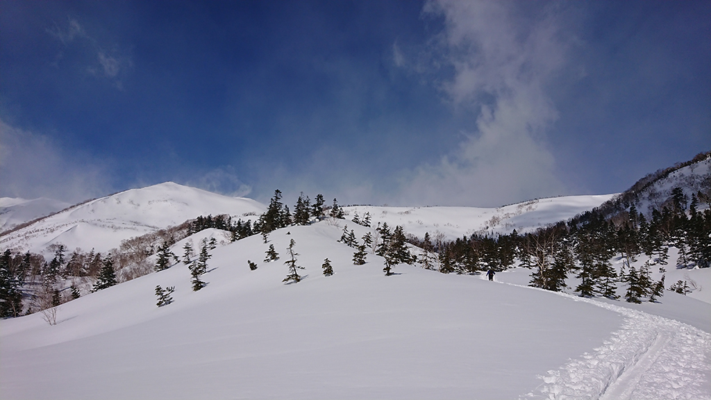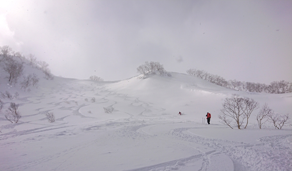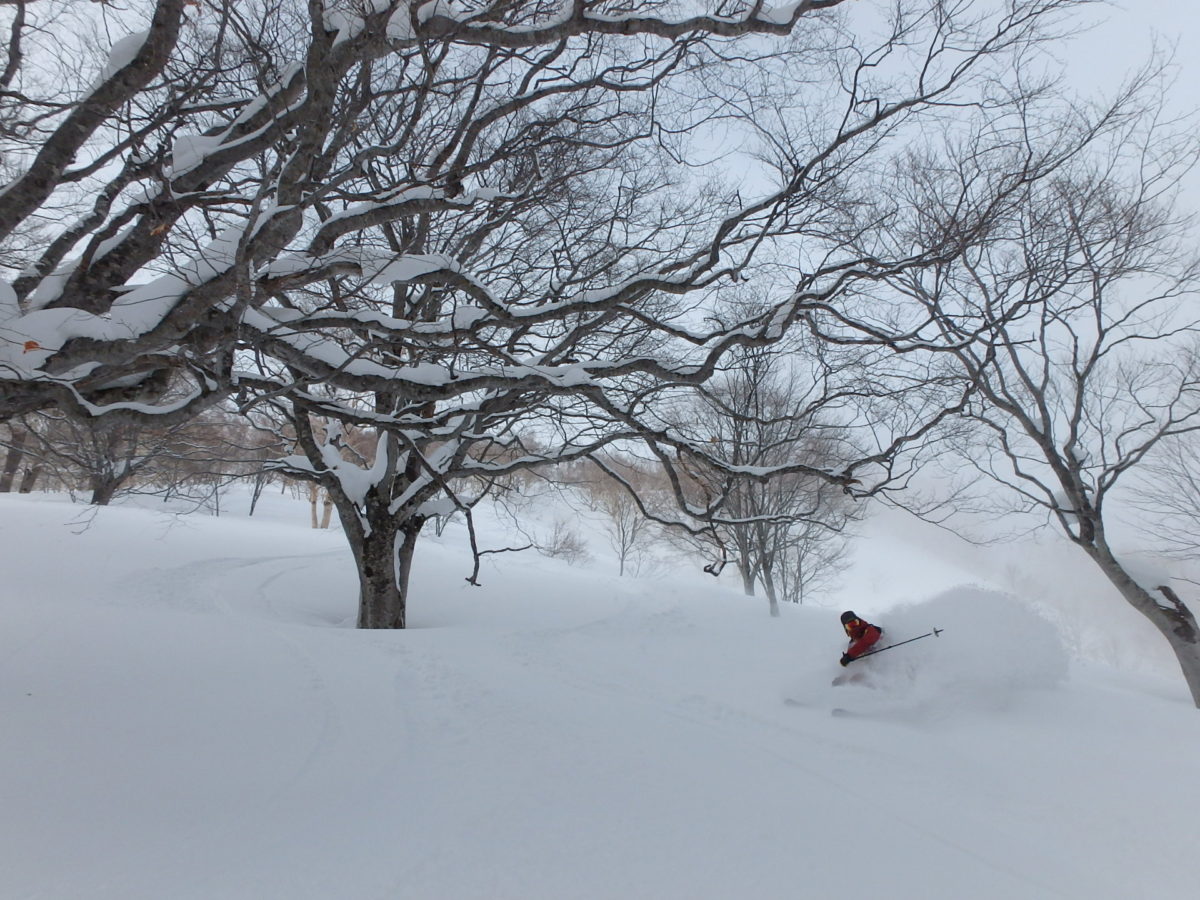 第3ペアリフトを下りて約150m(約15分)ハイクアップでスキー場の山頂(748m)まで上がると、その下にバックカントリーフィールドが広がっている。ムイカは山頂付近の標高が1000mにも満たないのに、まるで森林限界のように疎林帯となっているのが特徴。そこは広大な斜面のなかに点々と木々が生えた神秘的な世界だ。