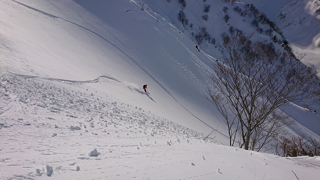 ただ、白馬乗鞍の南斜面に限ればコンディション次第で初心者でもOKだ。ルートは短く、すぐ降りて帰ってこられる。一方で、この南斜面はコンディションが変化しやすく、大きな雪崩が起こることもある。また、斜面にクラック(亀裂)が入り、視界不良の時などケガ人が出ることからも、コンディションや天候に大きく左右される場所だ。時折トラブルも起こるので、もちろんガイドについたほうが良い。