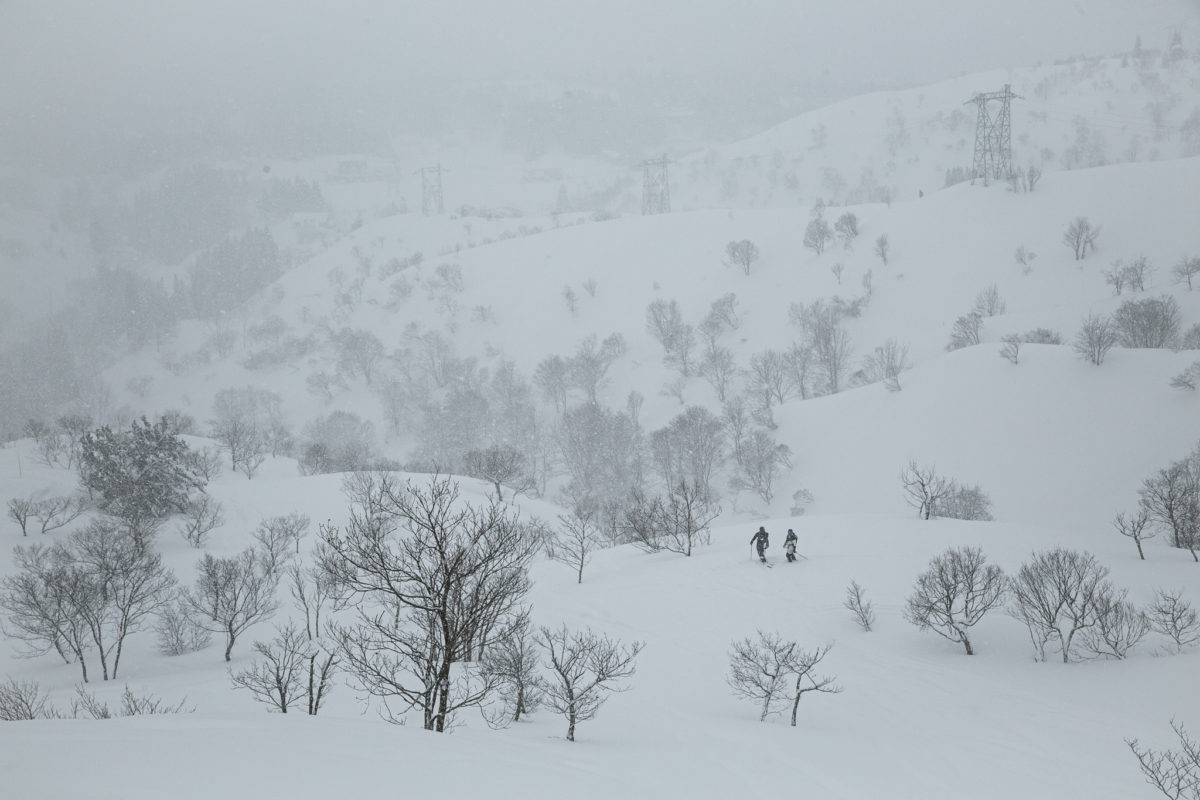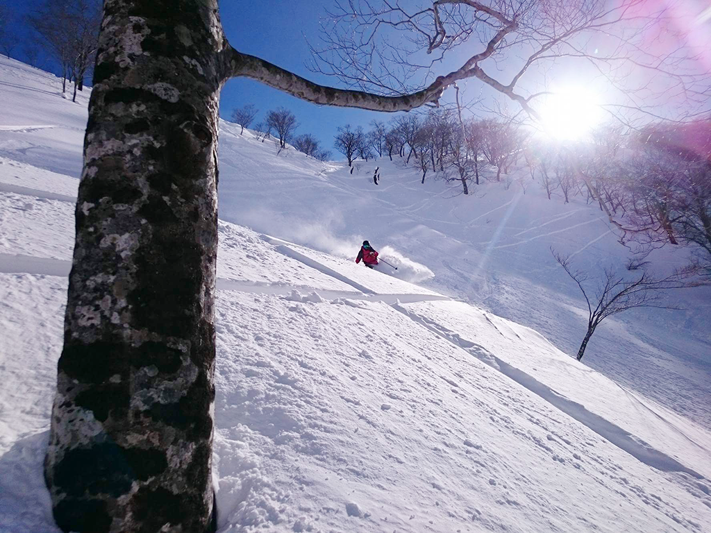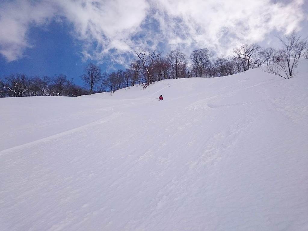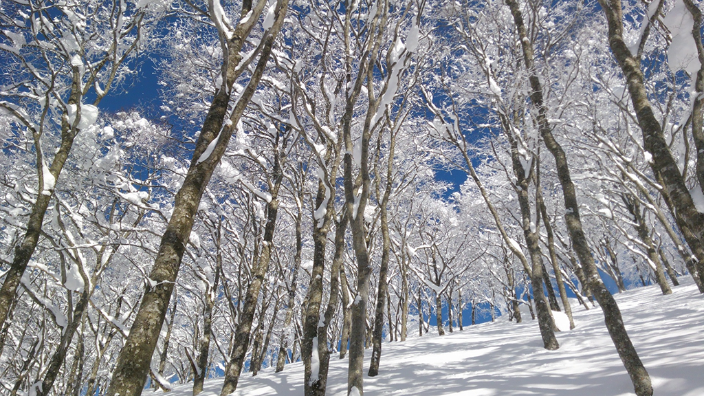森林限界は超えていないので、稜線まで行っても木はあるが上部は疎林で、中間部は適度な木の間隔を滑っていくことになる。上部はダケカンバ、途中からブナの樹林帯と変わっていき、植生の変化を楽しみながらツリーランが楽しめる。稜線に上がれば北信越の山々がよく見え、日本海まで見渡せる。