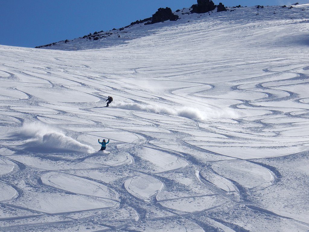 山頂トップからは雪崩必至の森林限界急斜面尾根が何本も伸びている。ここに挑戦する冒険的滑走を楽しむことも可能だが、雪の状況や天候、斜面変化に対応できる熟練の上級者でないとオススメできない。
