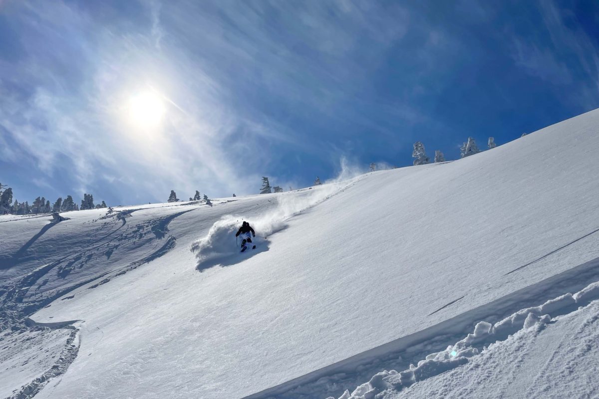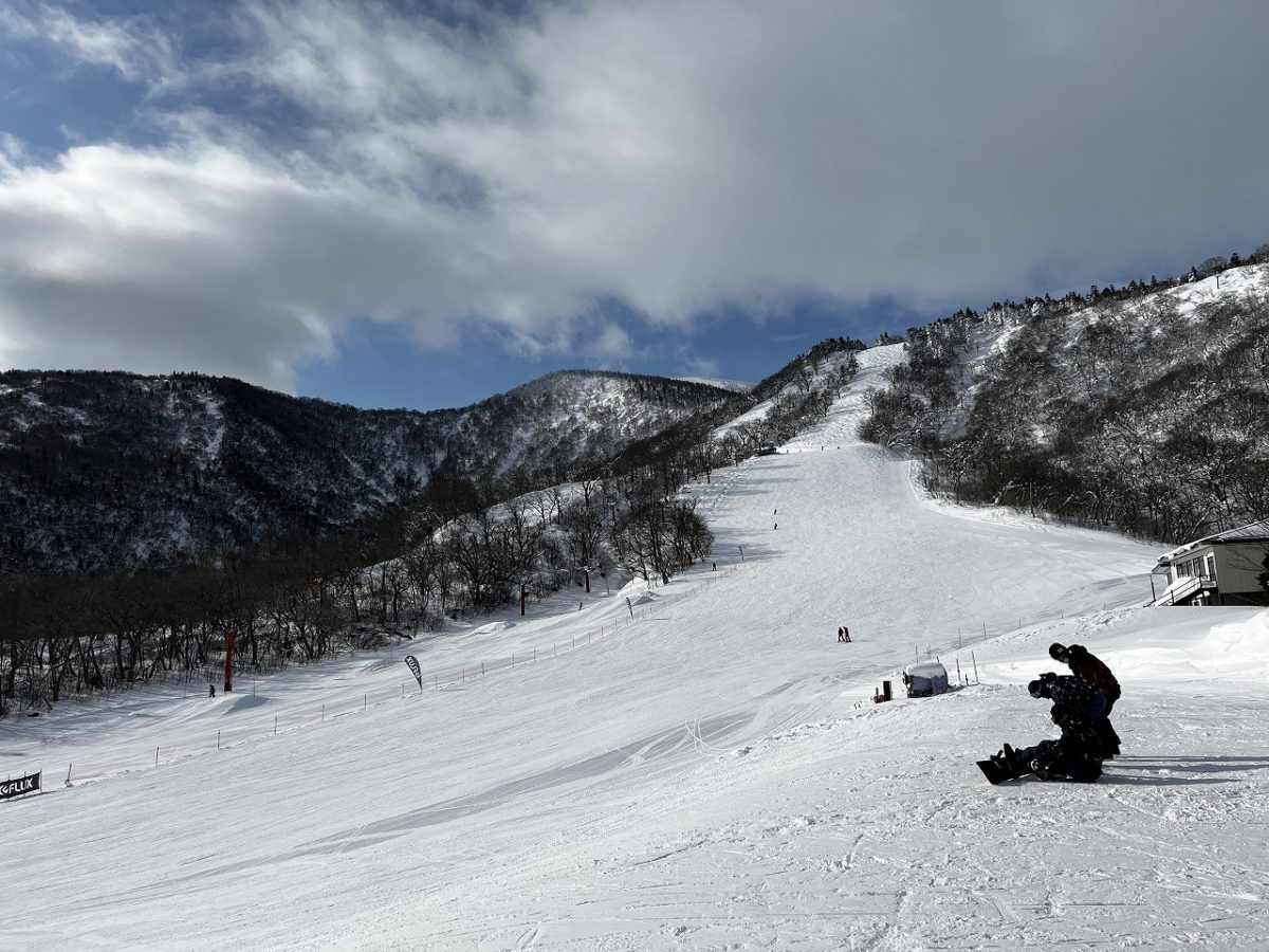 気温が低く、コンディションの良いうちに極上のパウダーをいただこう!ということで、山頂の手前のオープンバーンで滑走する。この日は表面を少し風にたたかれながらも、その内側にはフワフワサラサラのパウダーが眠っていた。降雪や風の吹き具合によっては深雪のパウダーを当てるのもそう難しくなさそうだ。