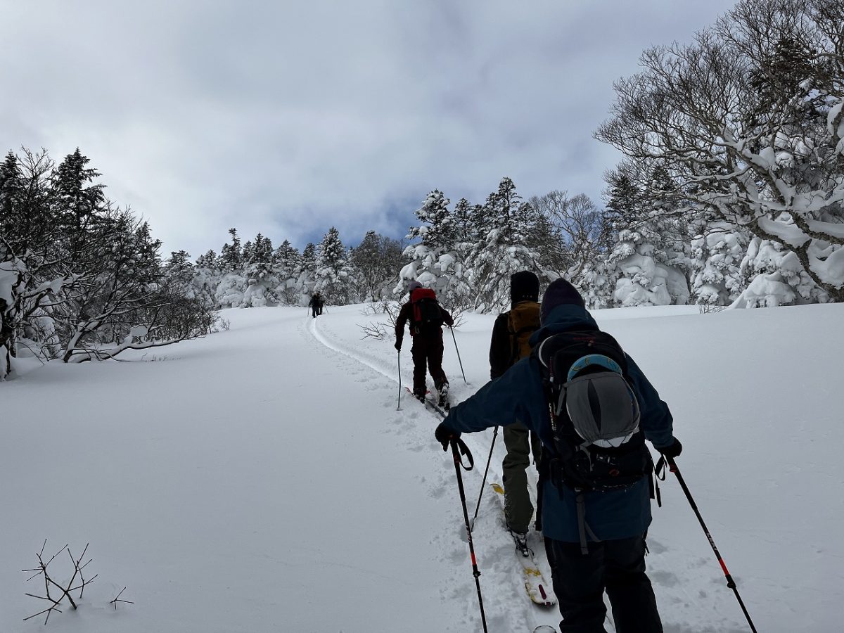 ツリーを滑ったら、スキータイムも終了。北にトラバースして、えぼしリゾートのゲレンデに向かう。トラバースするとスキー場の山頂付近に出るので、コースを下って駐車場まで戻ってツアー終了だ。