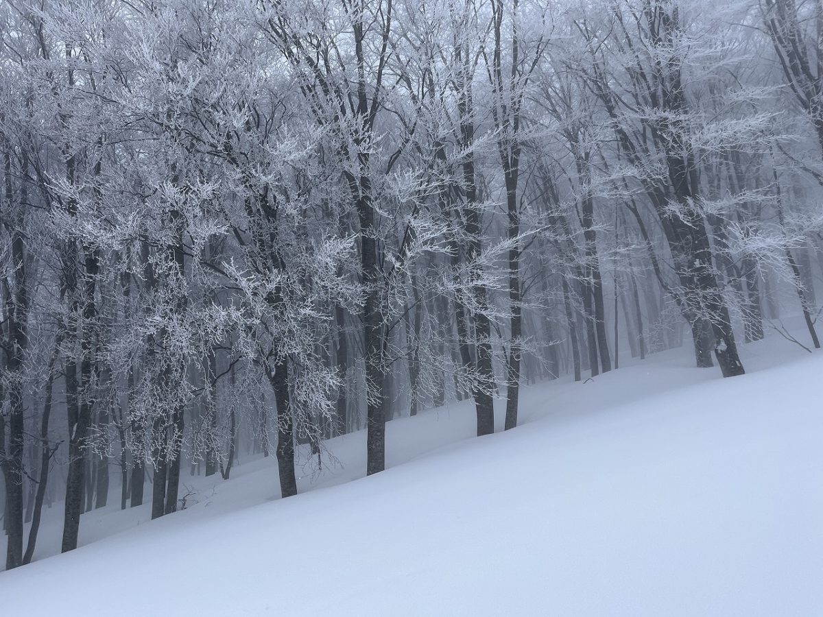 木の中なので風の影響も受けにくく歩きやすい。岩木山は入山者が多くないので、この日も先行隊のトレースは一組だけ。歩いている途中からノートラックのツリーランが楽しめそうな斜面が広がっている。