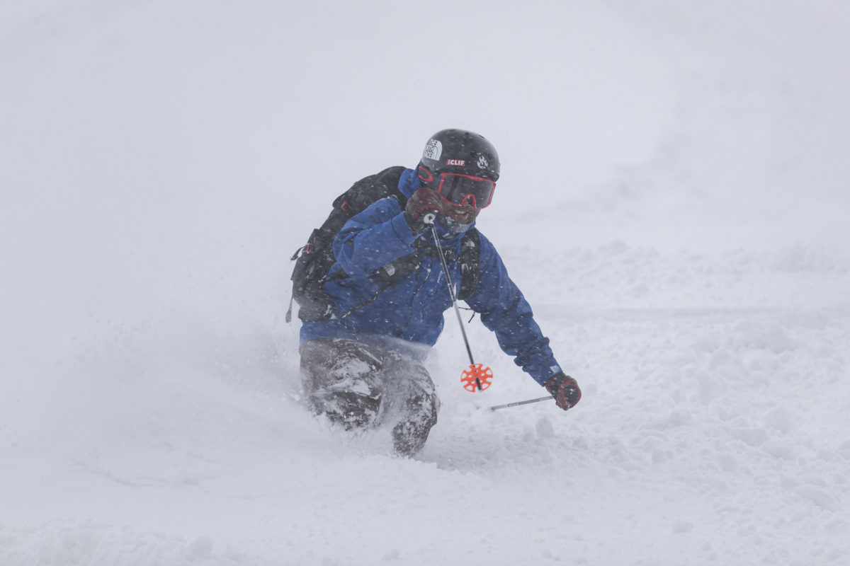 スキー場は吹雪いており視界はとても悪い。雪は良さそうだが、想像以上の悪天候に参加者の表情も曇りがち。そこへフォトグラファーの渡辺洋一さんがやってきた。今回はゲストガイドとしてスポット参戦してくれたのだ。ニセコの隅々までをよく知る彼の登場とあってガイドの佐々木大輔は