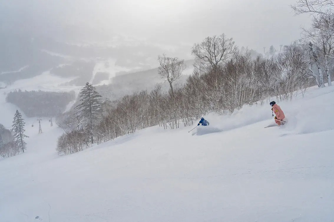 富良野スキー場は、標高1,074mの山頂から広がる北の峰と富良野の2つのゾーンから成り、ロングや非圧雪コースも含めてバリエーション豊かな全28コース。内陸ならではのドライなパウダーと美しいグルーミングが2軸で楽しめるのが最大の魅力だ。2つのゾーンいずれにも非圧雪コースがあるためパウダーライドもハズレがない。特に富良野ゾーンのパウダーに一番乗りをするには、新富良野プリンスホテルに泊まると便利だ。