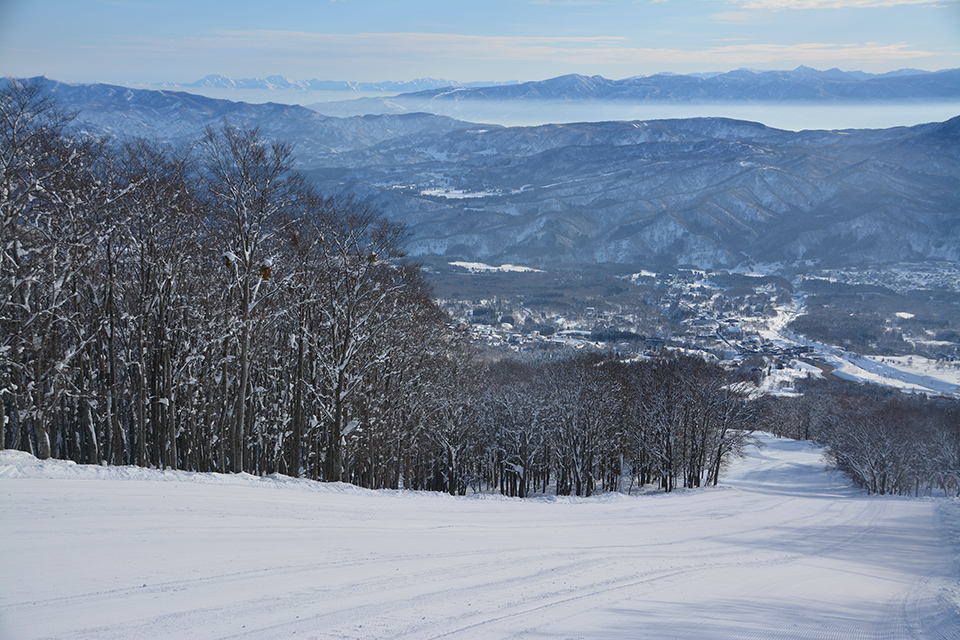 妙高エリアのなかでも、風光明媚な景観を眺めながらのロングランが楽しいと評判なのが妙高杉ノ原スキー場。標高約1,500mのゴンドラ山頂まで3kmで繋ぐ杉ノ原ゴンドラの眼下には、野尻湖や奥信濃が望める。標高差1,124mの滑走距離は、なんと約8.5kmというロングぶりで、日本でもトップクラスだ。 高速ロングターンを存分に楽しめることで人気の妙高杉ノ原は、カービング派を大満足させるだけでなく、パウダーフリークにも評価が高い。