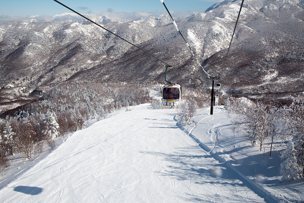 志賀エリアの中でも北志賀に位置する竜王スキーパーク。標高が1,930mと非常に高いため、ロープウェイや中腹のSORA terraceから、北アルプスや遠くは佐渡島まで見渡せる。時には雲海に沈む夕日が見られることもある、その景観の美しさは有名だ。
