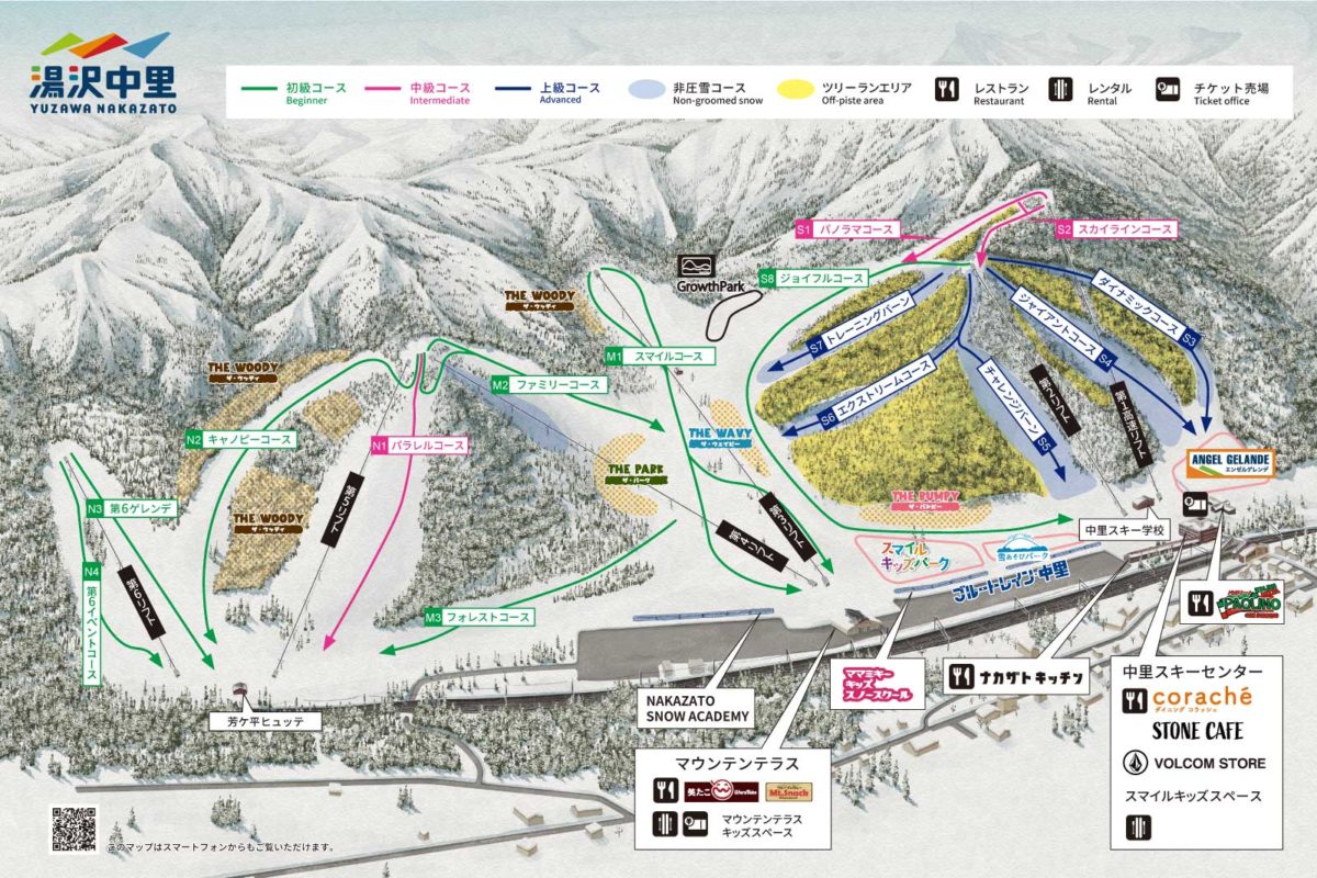 湯沢中里は2つの山からなり、マップ右側の山が1本の初心者コースを除いて、まるまるっと非圧雪・ツリーランエリアになっている。5つの非圧雪コースはダイナミック・ジャイアント・チャレンジ・エクストリーム・トレーニング。