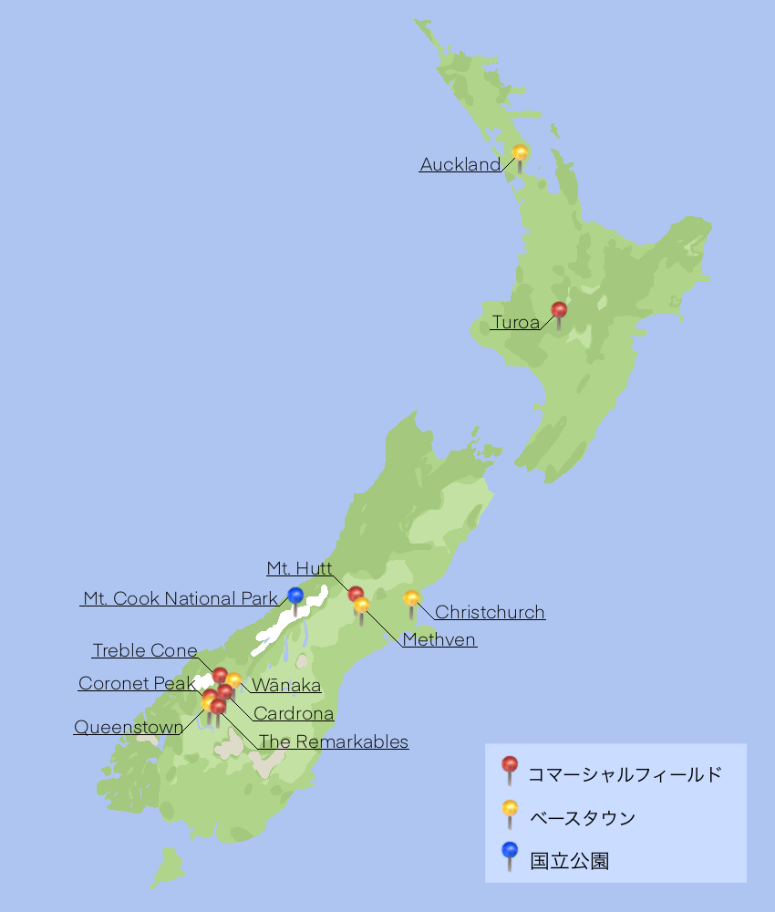 ニュージーランドで主要なコマーシャルフィールドは日本人にも有名人気で、スキー・スノーボードアスリートたちがトレーニングのために利用したり、ツアー会社の旅行パッケージなども多い。ベースタウンからアクセスも良く、シャトルバスも運行されているので、海外旅行者には便利だ。