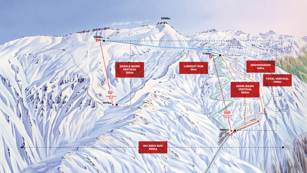 標高は1620mと比較的低めではあるが、なんと217基もの人工降雪機を稼働させることで常に安定したバーンコンディションを維持している。その数はもちろん南半球No.1だ。比較的、中・上級者向けの斜面が多く、コブ斜面もあれば、美しいグルーミングバーン、攻め甲斐のある急斜面と、バラエティなコースで様々な志向のスキーヤー&スノーボーダーを喜ばせている。