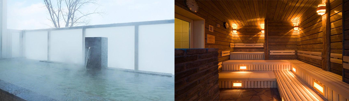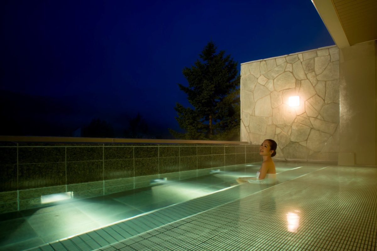 ルスツリゾートホテルのノースウイング6階奥側、幅20mという自慢の露天風呂からは、日中には目の前にいっぱいに広がる雪山の大パノラマが楽しめ、夜には空から落ちてきそうなほど輝く星が近くに見える。大きな内風呂、ジェットバス、一角にはヒーリング音楽が流れる洞窟風呂のほか、女性浴場にはミストサウナ、男性浴場にはドライサウナもある。滑った後は、北海道の大自然と柔らかなお湯に包まれて芯から癒されくつろげる。