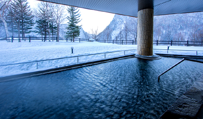 札幌市街からわずか35㎞、札幌市でありながら都市とは無縁の静寂さとピースフルな別世界の豊平峡温泉。国道230号線で中山峠方面へ走り、定山渓温泉街を右手に過ぎた先にあるため、札幌からニセコ・ルスツ方面へクルマで走る際に立ち寄る人も多く、スキーヤー・スノーボーダーの間では有名な温泉だ。源泉に手が加えられず、そのまま浴槽へ注がれている源泉100%かけ流しの温泉は、全国的にも希少で、空気に触れないため酸化せず、その分効果が高いという。露天は200名入れるという日本最大級サイズで、野趣たっぷりの雪見風呂は心からくつろげる。