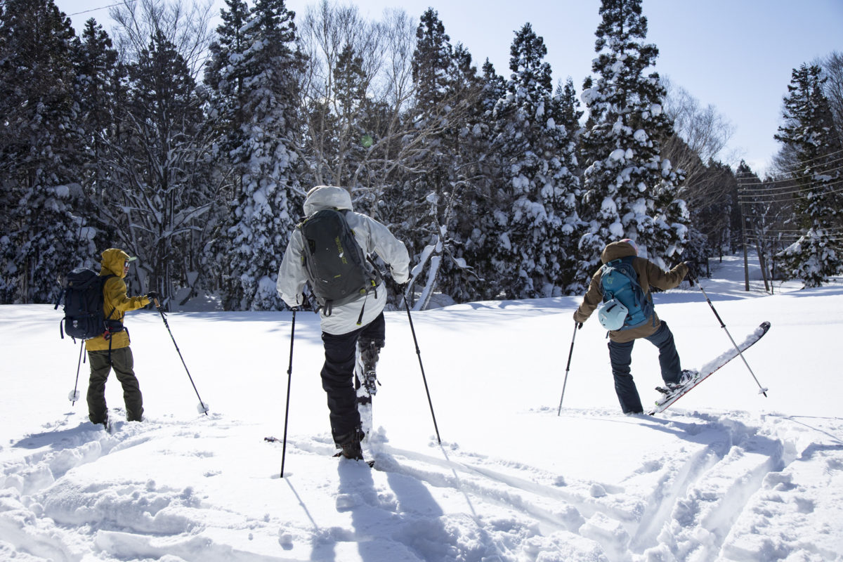 取材当日は晴天で遠くの景色まで見渡すことができ、雪深い中を歩き続けても、視覚的に楽しめた。もちろん圧雪されていない場所なので、ブーツで歩くとズボっとはまってしまう。動物の足跡しかないような森の中を進んでいく、何とも言えない心地よさと神秘的な風景を味わえるのもBCならでは。