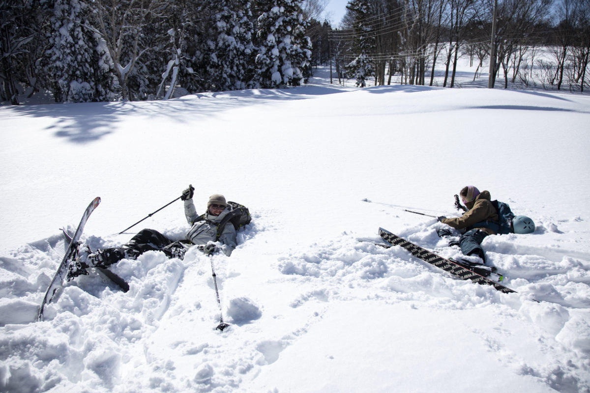 そして、転ぶと起き上がれない。普段滑っている時に転んでもすぐ立ち直れていたが、相手はふかふかのパウダー。なかなか力の入れ方がわからず、雪を支えにしようにも、そのまま奥底へと引き込まれてしまう。大の大人がガイドさんに引き起こしてもらうなんて、そんな恥ずかしいこともあった……。