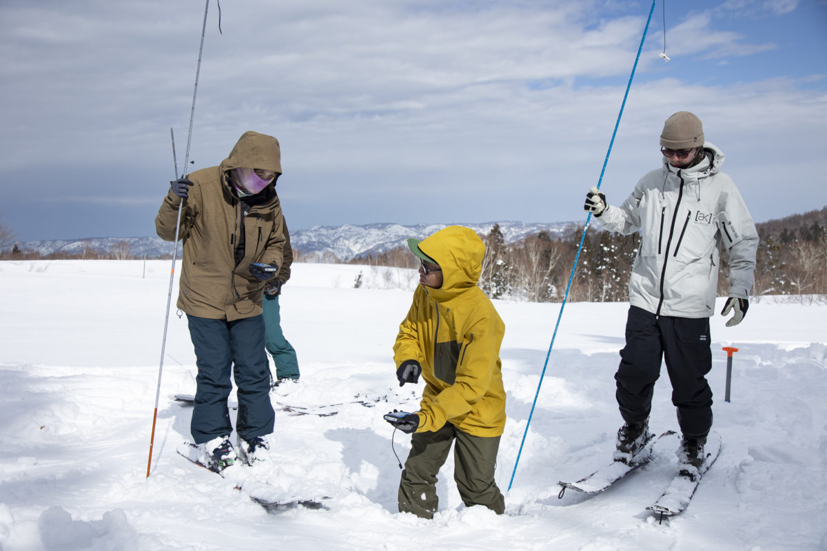 当日は野沢温泉スキー場、長坂ゴンドラの麓にある「Mt.DOCK」に集合。今回の参加者(対象者)は私と、ショップスタッフであるオーストラリア出身のラースさん。二人とももちろんBCは未経験だ。そんな初心者たちの講師は、河口 TKY 尭矢さんだ。