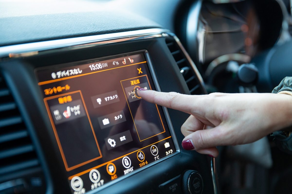 まずは、車高の高さが変わるエアサスペンション。乗車時は車高が低い状態で乗りやすくなっているのですが、スピードに応じて車高が高くなり視界がとてもよくなるのと、振動も和らいで乗り心地もよくなります。ちょっとした雪の塊が道路に転がっていても気にしないで走れるのでとても楽です。子供を乗せるときも楽なので、日常使いにはぴったりですね。(グランドチェロキーの車高は5段階あり、スピードに応じて自動で変わる走行―モードや高速モードのほか、手動で切り替えてさらに高さを出せるオフロードモードが搭載されている)