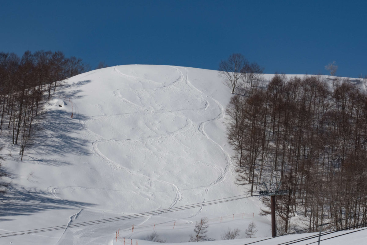 リゾート1のフワフワパウダーが積もる非圧雪コース。斜度も適度でスピードに乗ったターンでビッグスプレーを巻き上げられる。パウダーの朝にリフト一本でたどり着けるのが魅力だ。降雪があったら、まずここへ! また天然のコブが育ちやすいため、モーグル練習にも最高。