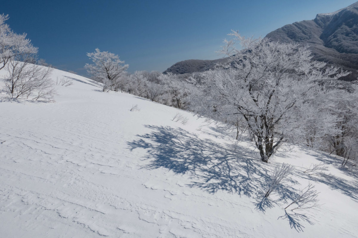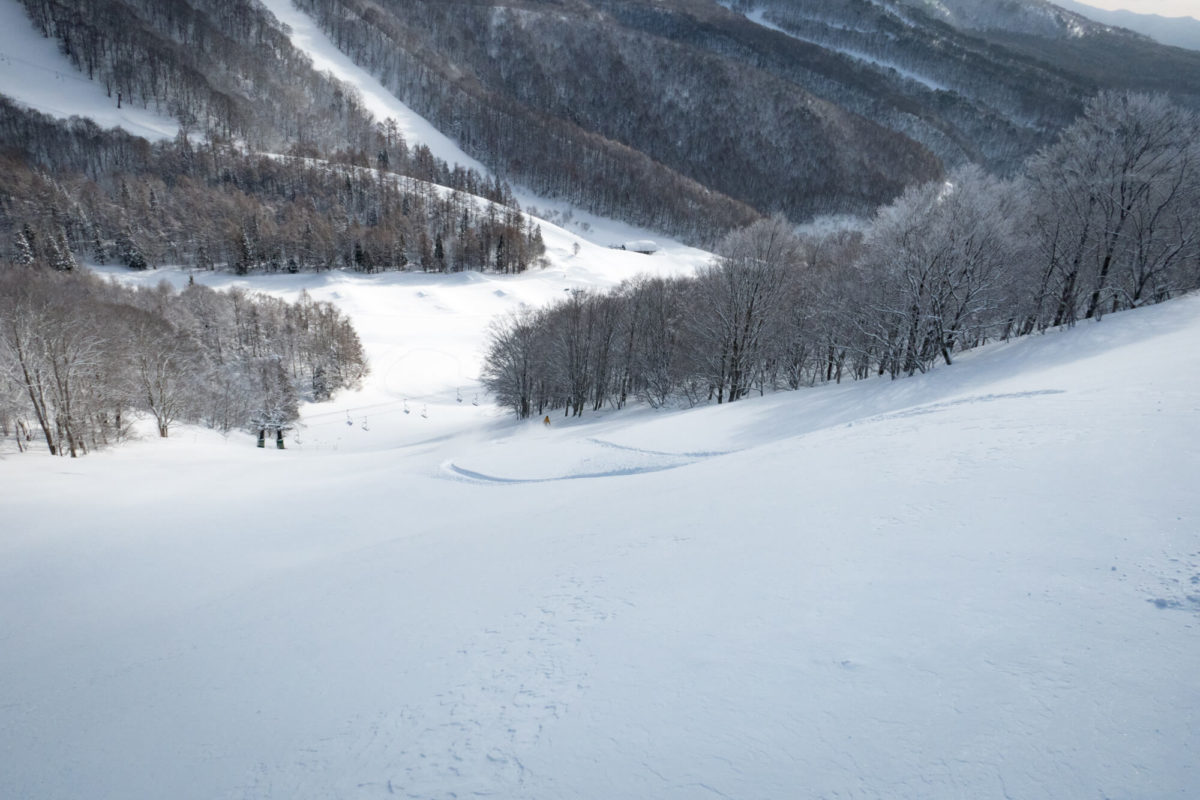 基本は非圧雪でパウダーを楽しめるコース。滑り出しは斜度があるため、スピードに乗ってロングランを楽しめる。降雪後の晴れた日は周りに美しい霧氷が見られ、景観もベリーナイスだ。