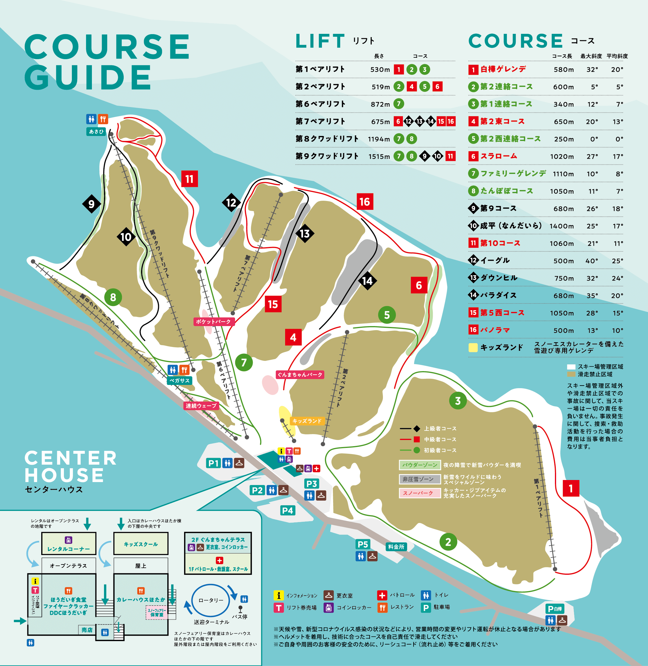 | コース数 16本 | リフト 7本 | ゴンドラ -基 | ロープウェー -本 |