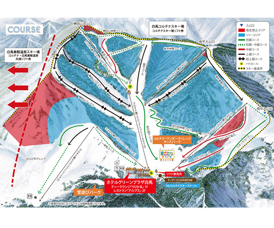 ベースから左右2本の尾根に挟まれたコースレイアウトに6本のリフトが架かる。16のコースの多くはホテルグリーンプラザのあるベースに合流できるため効率よく回せる。スティープ&ディープのパウダーライディング、ツリーエリア、上級者向けのハードバーン、北アルプスの絶景、温泉と、楽しみは尽きることがない。トップエリアからは数方向の広大なバックカントリーへのアクセスもスムーズと、言うことなしの白馬パウダーの雄だ。