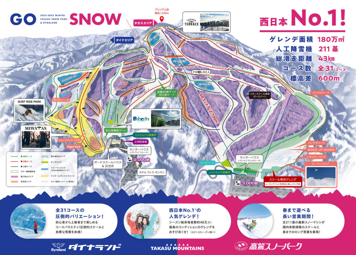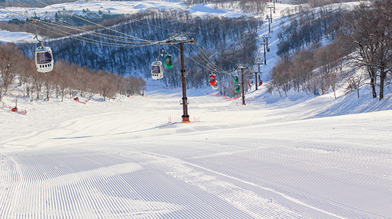 ゲレンデトップの標高1,550mまで、全長2,700mの15人乗りゴンドラで一気に上がれる。ゲレンデ上部ではダイナランドと繋がっており、共通リフト券で2つのビッグゲレンデを自在に行き来できる。その最長滑走距離は4,900m、その他にも4,000mを超えるロングコースが2本あり、ロングクルージングを楽しむのに最適だ。