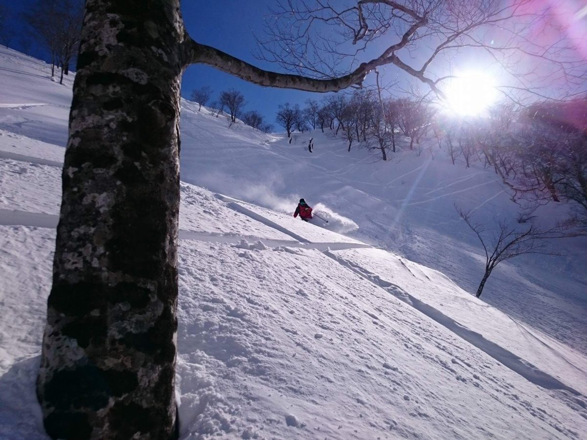 峠裏コースと呼ばれる圧雪される斜面。平均斜度は18度。降雪後は中級者でもパウダー滑走が楽しめるラインだ。天神峠リフト降り場からの眺望も味わってほしい。
