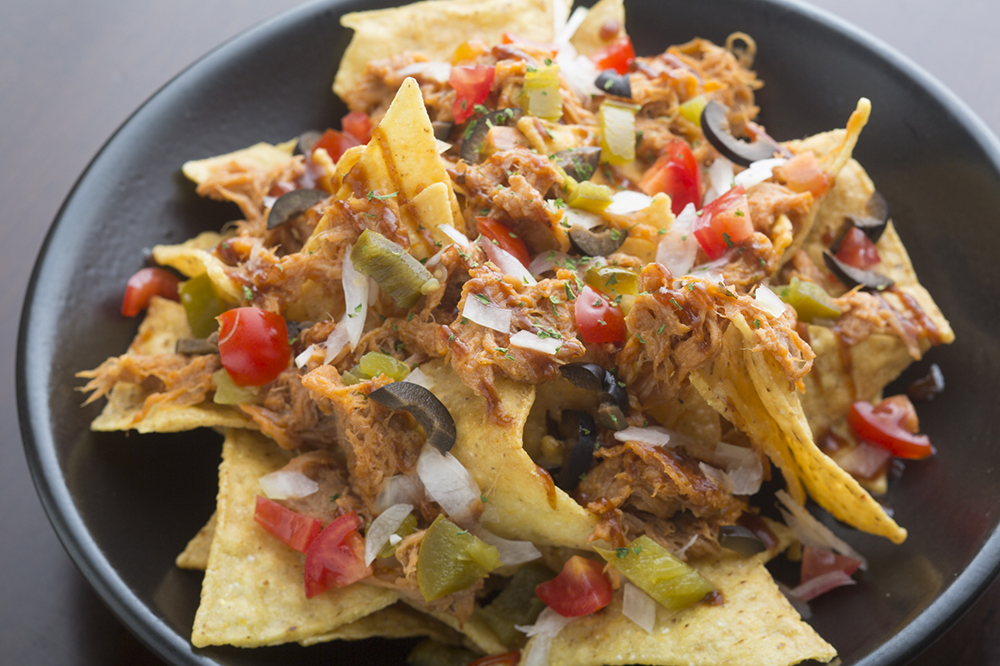 ジューシーなプルドポーク&さっぱりサワークリームがトルティーヤチップスとベストコンビネーション! 病みつきになる味。仲間で楽しくシェアしたい。
