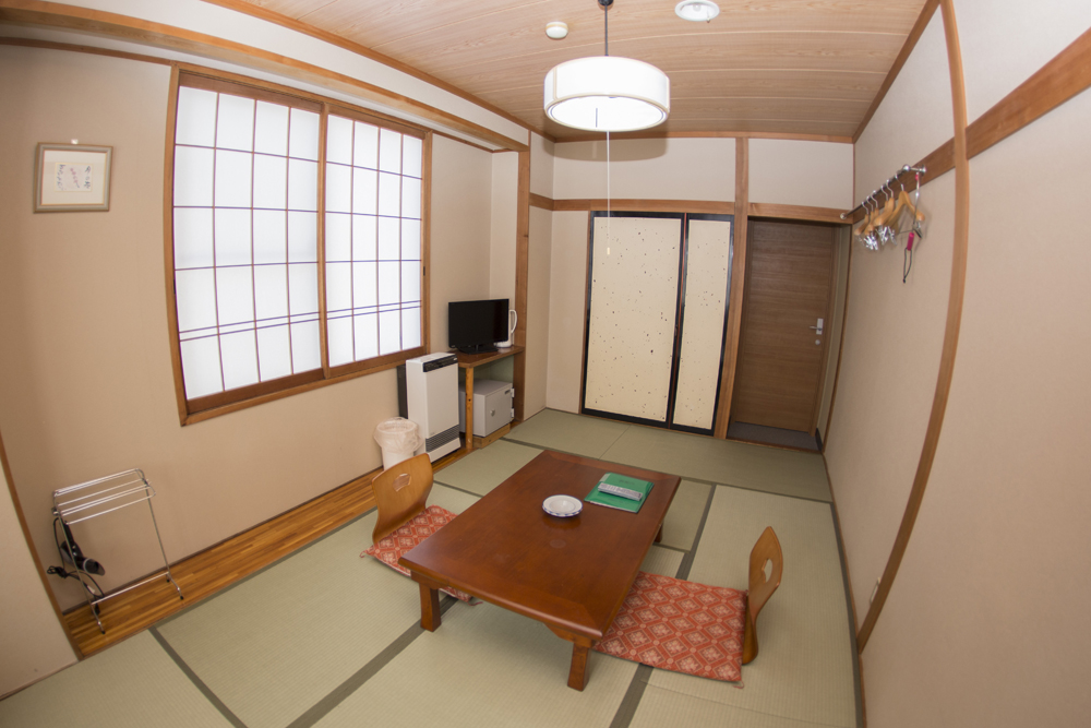 館内は落ち着いた和の造り。客室はすべて和室で6畳~8畳まで。フロントまわりの談話スペースでくつろぐのも快適。