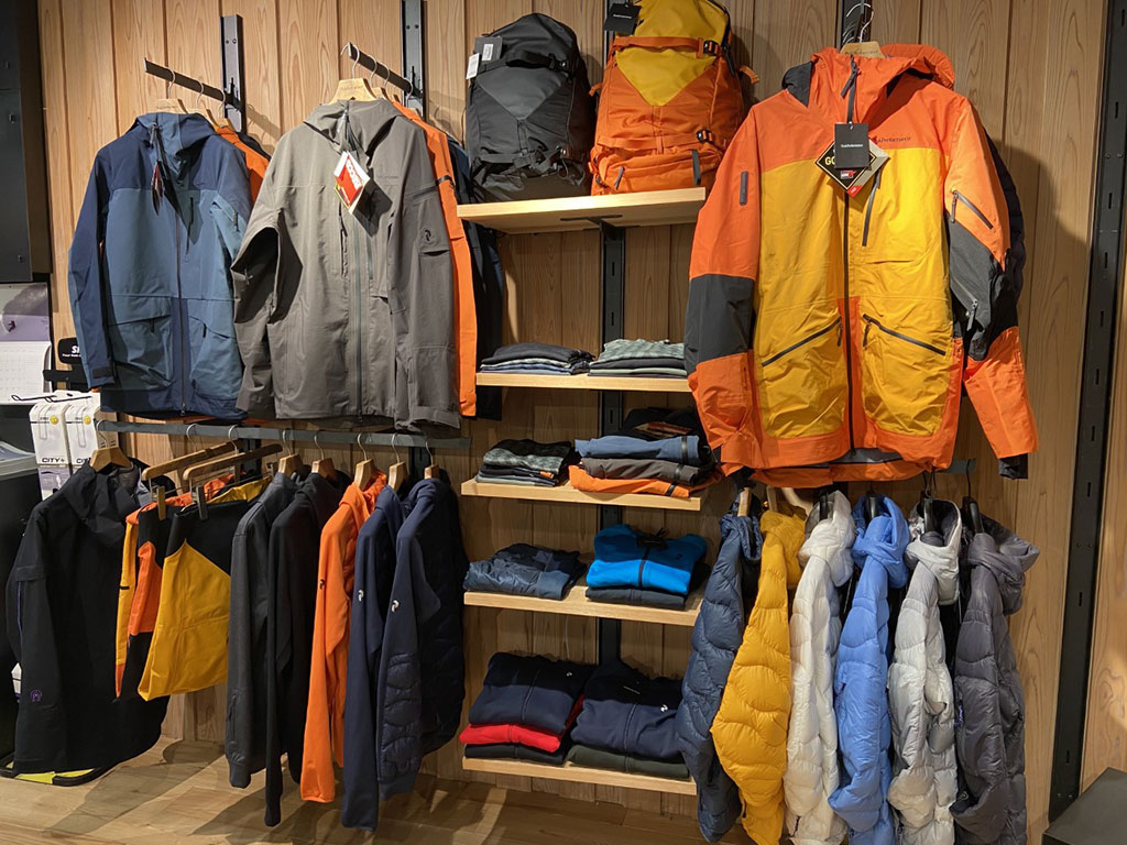 主に取り扱っているのはウェア、ギア(ゴーグル、ヘルメット、グローブ等)、スキーケースを含むバッグ類。ウェアはスタッフ皆でできるだけフィールドで試すようにしていて、実感に基づいたアドバイスを心がけているという。