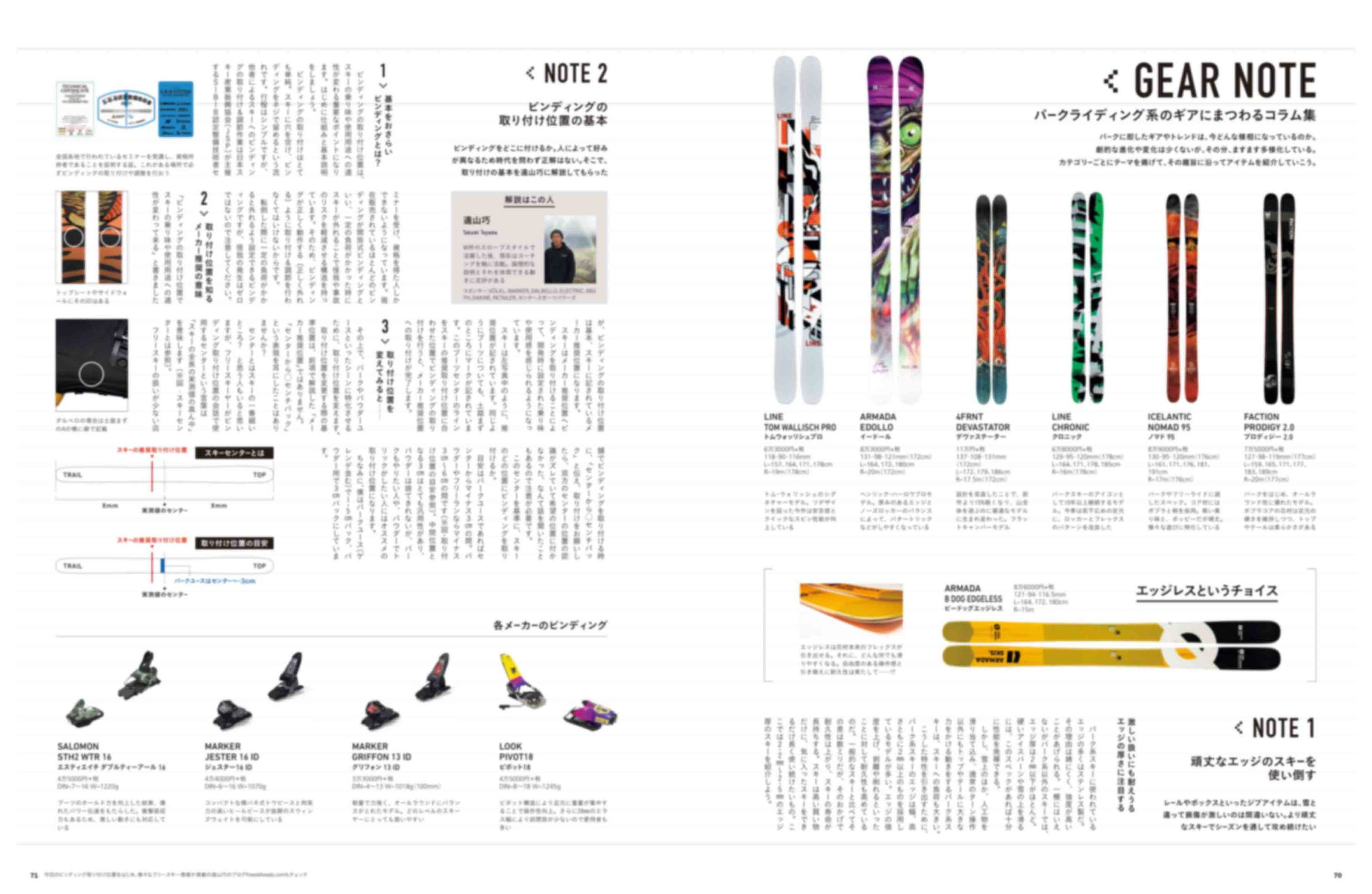 FREESKIING読者に向けた、ギアにまつわるコラム集。ビンディングのチョイスや話題のエッジレススキーなど、気になるアレコレを掲載。
