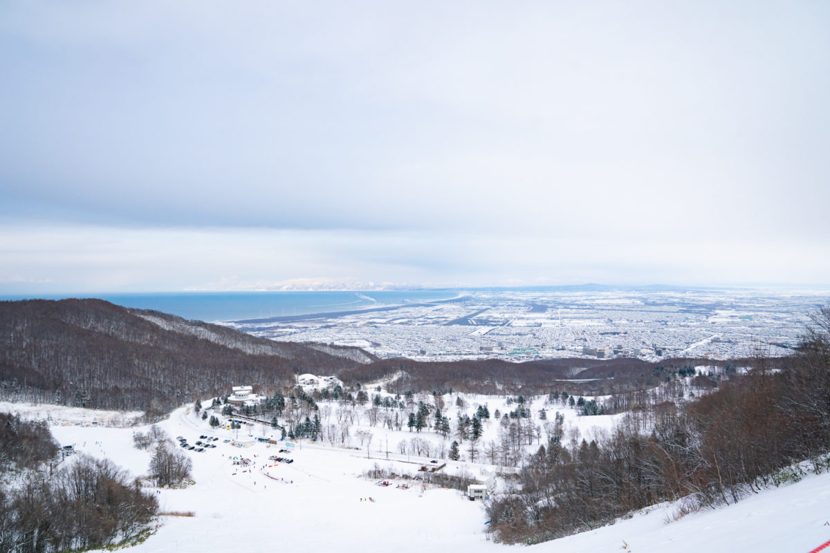 聖火台第一リフトを降りるとこの景色。見慣れている札幌の街だが、いつ見ても、雪と街と海の組み合わせは絶景だ。