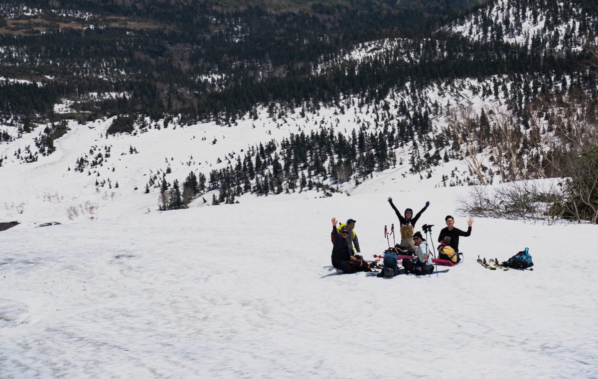 そして滑り納めると、美しすぎる白馬大池の絶景を撮る愛子、その池の畔で水遊びをする慧介、山の魅力に取り憑かれたのか、がむしゃらに登り返し滑り納められないノブ、負けじと登り返し流石のラインで滑りきり、おにぎり片手にビールを心待ちにしている淳也がいた。