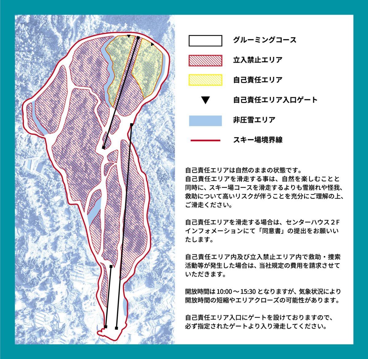 このマップの黄色い部分が自己責任エリアでツリーランが可能となった場所だ。標高920mのゲレンデトップへと架かる1000mの第2クワッドリフトの両側、上部からざっくりと半分ほどの森林帯が滑走可能になった。