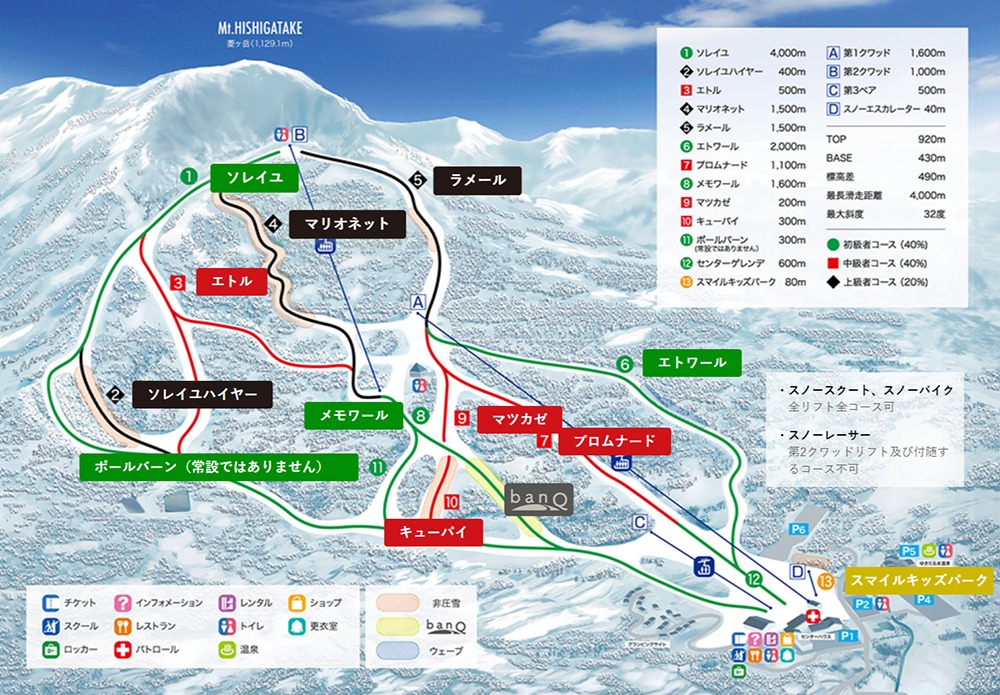 | トップ標高 920m | 最長滑走 4,000m | 標高差 490m | 最大斜度 32° |